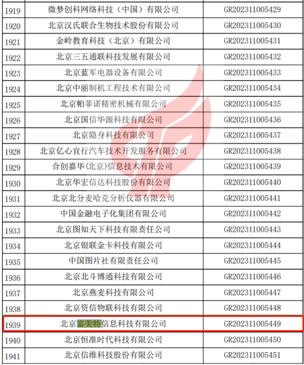全國高新技術(shù)企業(yè)認(rèn)定管理工作領(lǐng)導(dǎo)小組辦公室于2023年12月19日發(fā)布了《關(guān)于對對北京市認(rèn)定機(jī)構(gòu)2023年認(rèn)定報(bào)備的第三批高新技術(shù)企業(yè)進(jìn)行備案的公告》,北京富美特信息科技有限公司被列入北京市2023年認(rèn)定報(bào)備的第三批高新技術(shù)企業(yè)備案名單,通過了高新技術(shù)企業(yè)認(rèn)定,證書編號(hào):GR202311005449,證書有效期三年。
